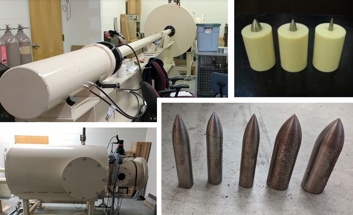 The Impact Testing and Multiscale Characterization Laboratory of Virginia Tech Professor Dr. Linbing Wang contains a light gas gun for impact and ballistic experiments. The single stage launch system consists of an 18 ft (5.5 m) long 3.15 in (80 mm) diameter barrel designed for planar impact experiments. Using compressed He gas, the double diaphragm firing system can reliably accelerate 1.5 lb (700 g) payloads in excess of 3,300 ft/s (1000 m/s) in a safe and repeatable manner. At these velocities, cementitious, ceramic, metallic, geological, textile, and soft media can be subjected to impact pressures many thousands of times the pressure of air at the surface of the Earth. Experiment packages can be fired upon by a range of projectiles whose shape, velocity, and material hardness can be tuned to precisely attain the desired impact characteristics. Controlled environment impact tests under high or low temperature and specific magnetic field conditions can also be accommodated. Experimental diagnostics consist of optical projectile velocity measurement, high speed data acquisition systems, and Cordin 350 high speed camera (up to 1 million frames per second, with a total of 16 frames).